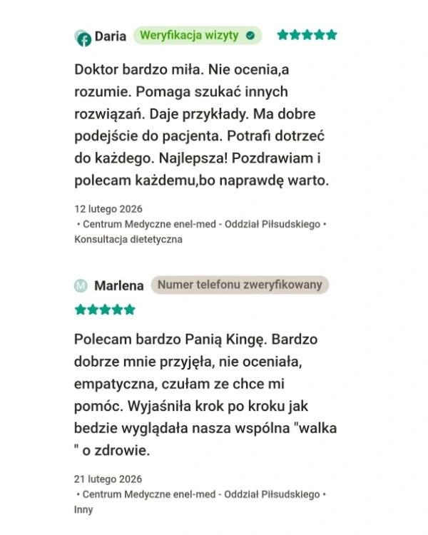 Współpracuję również z Centrum Medycznym Enel Med, gdzie prowadzę indywidualne konsultacje dietetyczne oraz jestem dietetykiem klinicznym współpracującym z zespołem terapeutycznym w ramach PROGRAMU OPIEKI KOORDYNOWANEJ na terenie Łodzi i Andrespolu.